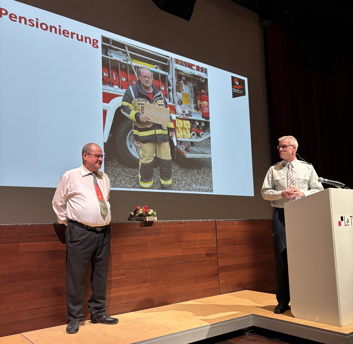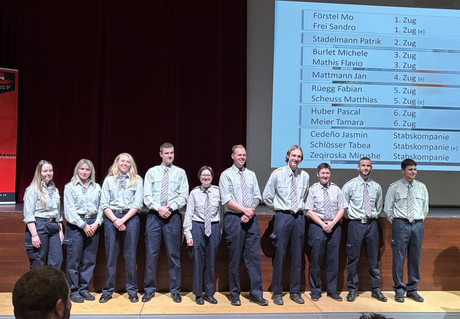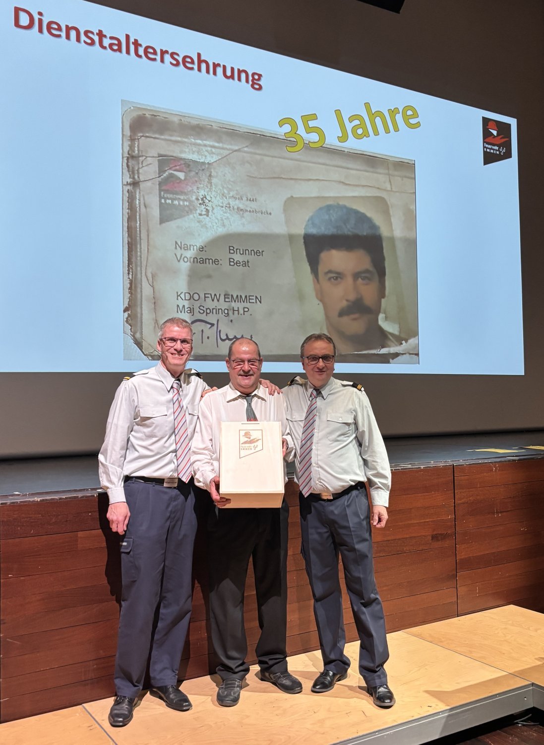 Eindrücklich und mit viel Witz wurde die Kleber-, Anhänger- und Westen- Flut der Feuerwehr Emmen präsentiert und dazwischen von Bannwart Roger herrlich glossiert. Nach der Vorspeise wurden die Feuerwehrleute und Gäste vom Feuerwehrkommandant Hermann Roger begrüsst. In einem ersten Teil hielt der Kommandant Rückschau auf ein normales Feuerwehrjahr. Insgesamt mussten 201 Einsätze bewältigt werden. Vier spezielle Events im vergangenen Jahr wurden durch ihn hervorgehoben. Das waren die zwei unangemeldeten Übungsinspektionen, die Einsatzübung der ganzen Feuerwehr beim SSBL, die grosse Strassenrettungsübung auf der T10 und der Tag der offene Tore vom 31.08.2025. Ebenso wurden zahlreiche Feuerwehrangehörige für ihre langjährige Treue im Feuerwehrdienst geehrt: