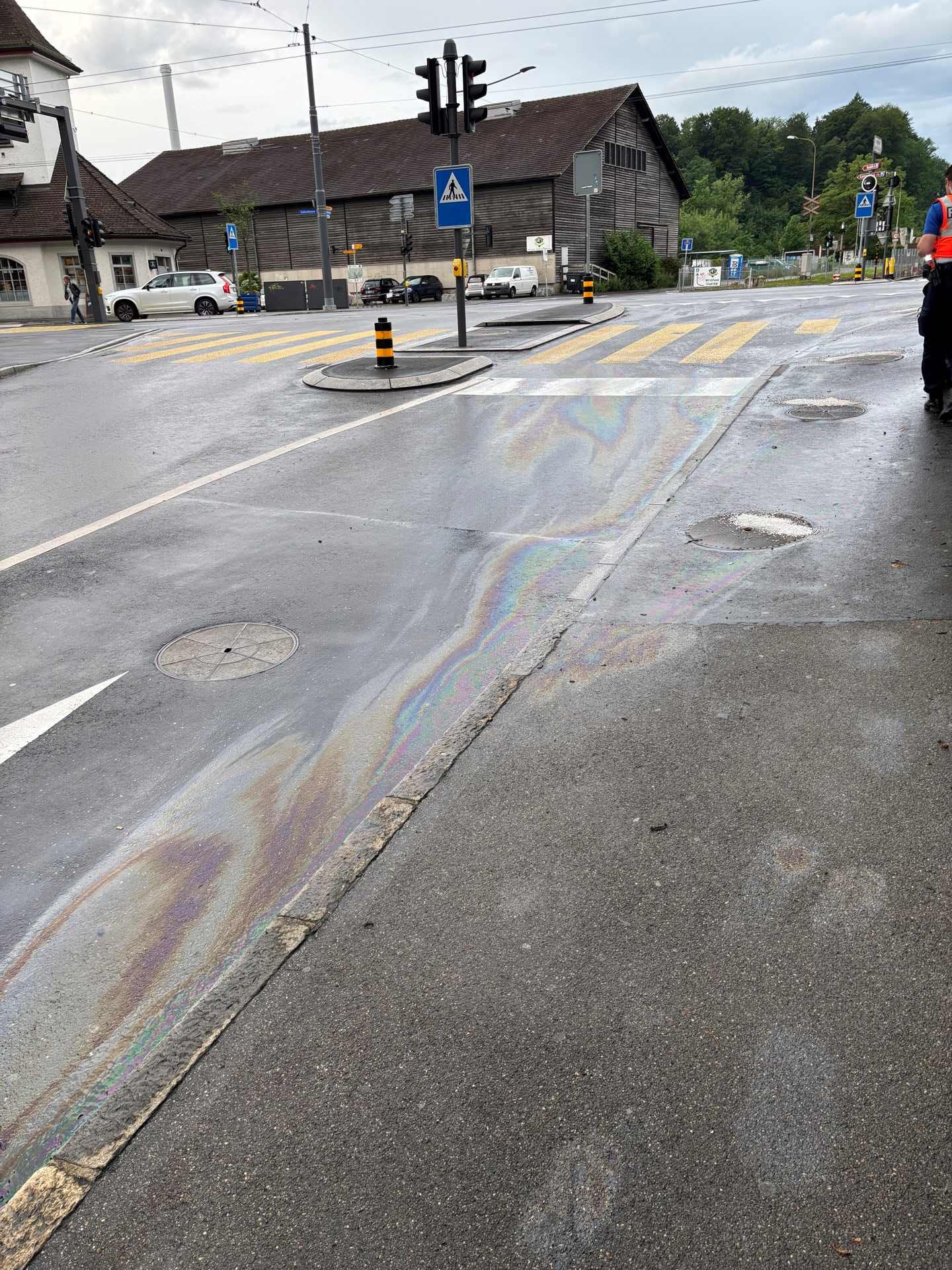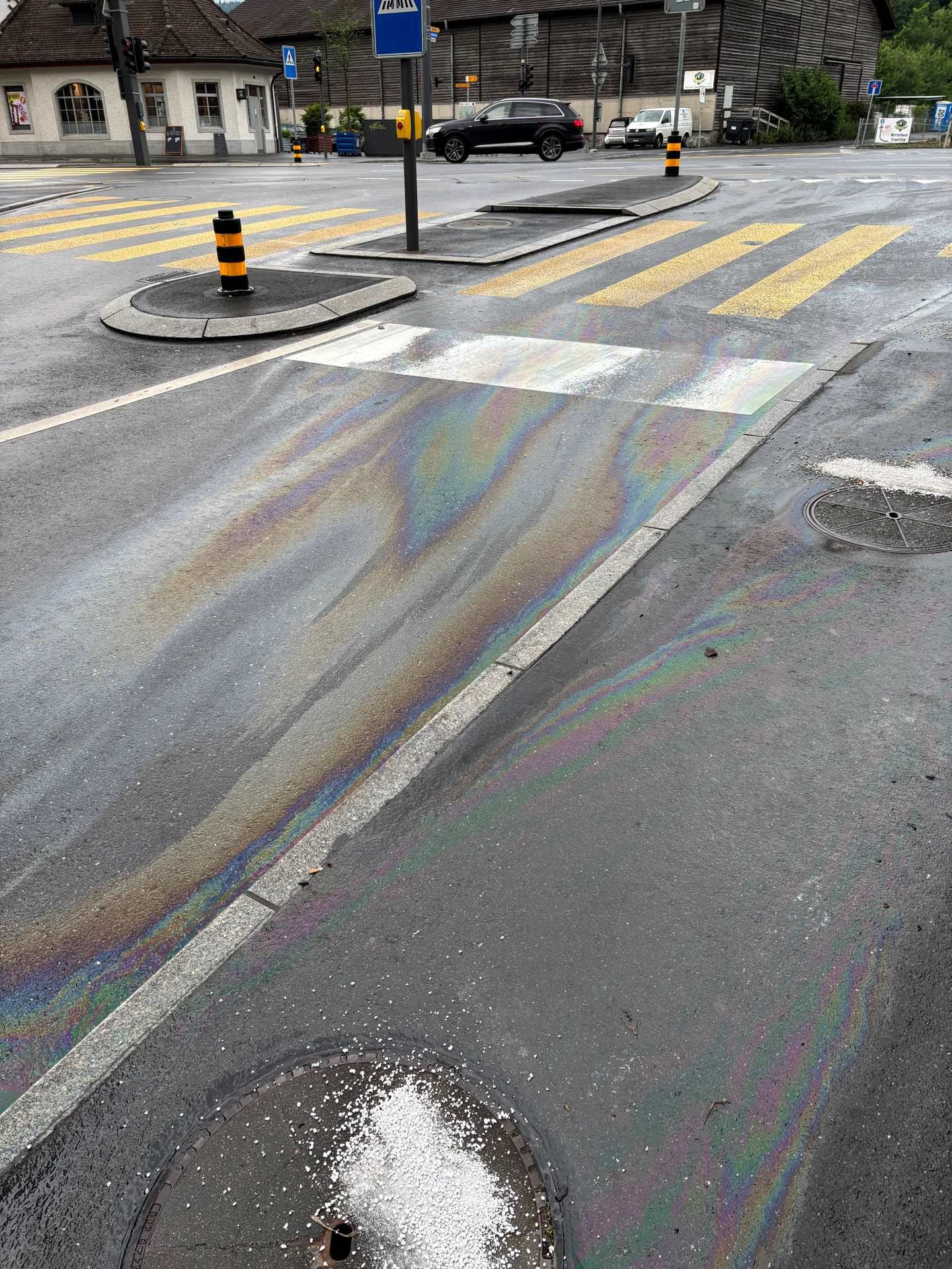 Oel auf der Fahrbahn verursacht durch eine Ölflasche